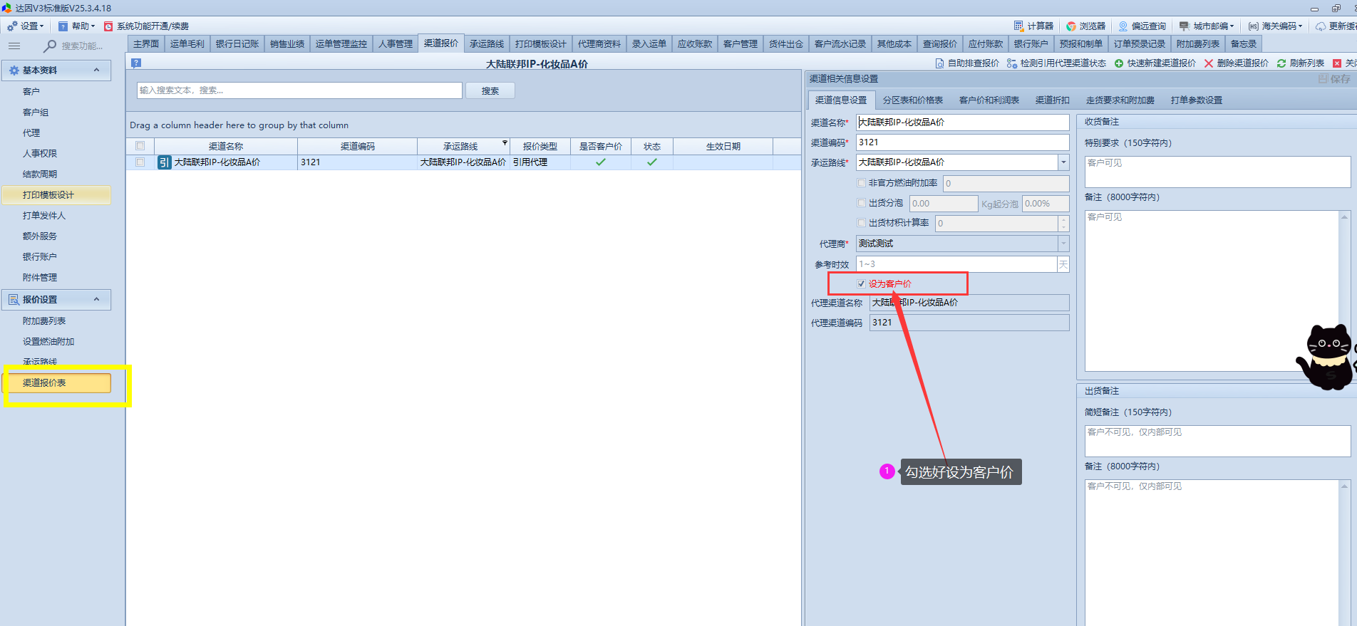 引用代理渠道加利润作为客户价;首先对接好代理商然后再查询报价找到所需要的渠道,鼠标右键加入渠道列表,可以直接新建承运路线 绑定对应的路线 在确定保存 一个渠道需要对应一个承运路线,没有对应的路线需要点新增路线 加入到渠道后打开渠道报价功能,选中这个渠道,点开客户价和利润表选择好利润模板在勾选好设为客户价保存即可。 文档更新时间: 2025-03-06 16:03 作者:dy13750292337