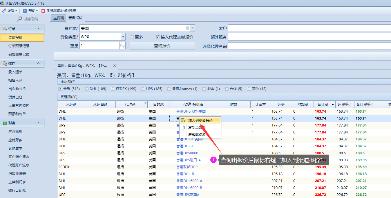 目录 搜索 系统简介功能列表查询报价订单预录记录到货测重记录录入运单扫描入仓出仓前分货货件出仓运单管理监控预报和制单财务应收账款应付账款其他成本客户账户流水代理账户流水销售业绩主营利润表银行日记账自定义账单模板基本资料-设置引用代理渠道加利润作为客户价代理对接客户资料人事权限打印模板设计打单发件人额外服务银行账户附加费列表设置燃油附加承运路线渠道报价渠道附加费及条件设置浏览器常用问题刚开通如何配置基础数据怎么对接代理打单如何删除对接的代理Fedex(新版RESTful接口)授权流程DHL Parcel DE 授权流程(v2版本)敦煌对接EMS对接UPS(新版RESTful接口)操作流程账单模板原始文件系统对外接口api微信公众号怎么绑定系统达因移动OA查价空白的解决方法公众号链接后缀客户端对接到微信公众号系统常见问题和快捷方式运单管理监控自定义教程速递管家获取API参数教程哲盟获取API参数教程如何在客户端下单视频教程 暂无相关搜索结果! 本文档使用 MinDoc 发布 引用代理渠道加利润作为客户价 引用代理渠道加利润作为客户价;首先对接好代理商然后再查询报价找到所需要的渠道,鼠标右键加入渠道列表,可以直接新建承运路线 绑定对应的路线 在确定保存 一个渠道需要对应一个承运路线,没有对应的路线需要点新增路线 加入到渠道后打开渠道报价功能,选中这个渠道,点开客户价和利润表选择好利润模板在勾选好设为客户价保存即可。 文档更新时间: 2025-03-06 16:03 作者:dy13750292337
