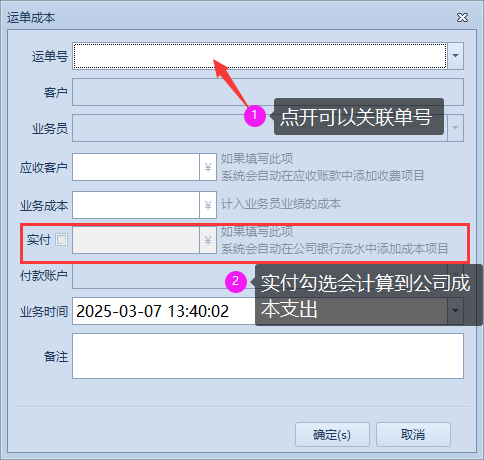 其他成本;可新增公司其他支出和收入。 运单成本;是可以关联单号设定额外的成本支出,会跟运单一起计算毛利。销售成本;是指业务员其他额外的支出或公司其他支出会计算到销售业绩。(勾选实付填写金额=公司支出费用)客户成本;是指客户有付款额外的金额等于公司额外的收入金额。 文档更新时间: 2025-10-17 10:09 作者:dy13750292337