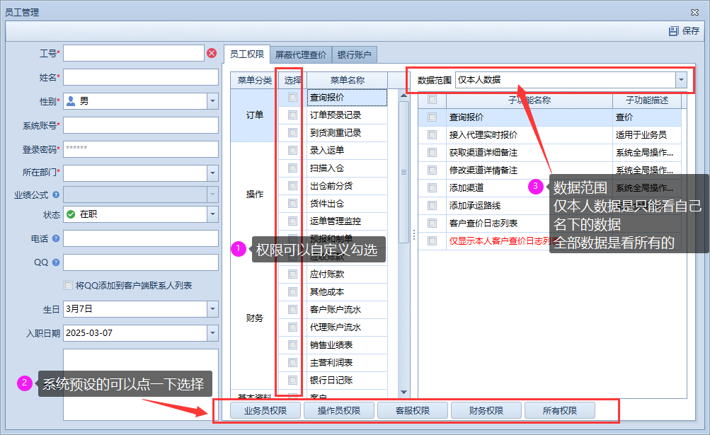 人事权限 视频演示人事权限;点开后右上角新增员工子账户,账号密码名称都可以自定义,新增好安装系统登陆即可。 权限设置;可以自定义勾选,勾选权限时需注意(隐私设置及红色字体的权限)每个功能板块都可以自定义数据范围,可以自定义勾选每个功能的修改和删除功能 注;隐私权限 红色字体权限需注意勾选文档更新时间: 2025-10-17 13:55 作者:dy13750292337