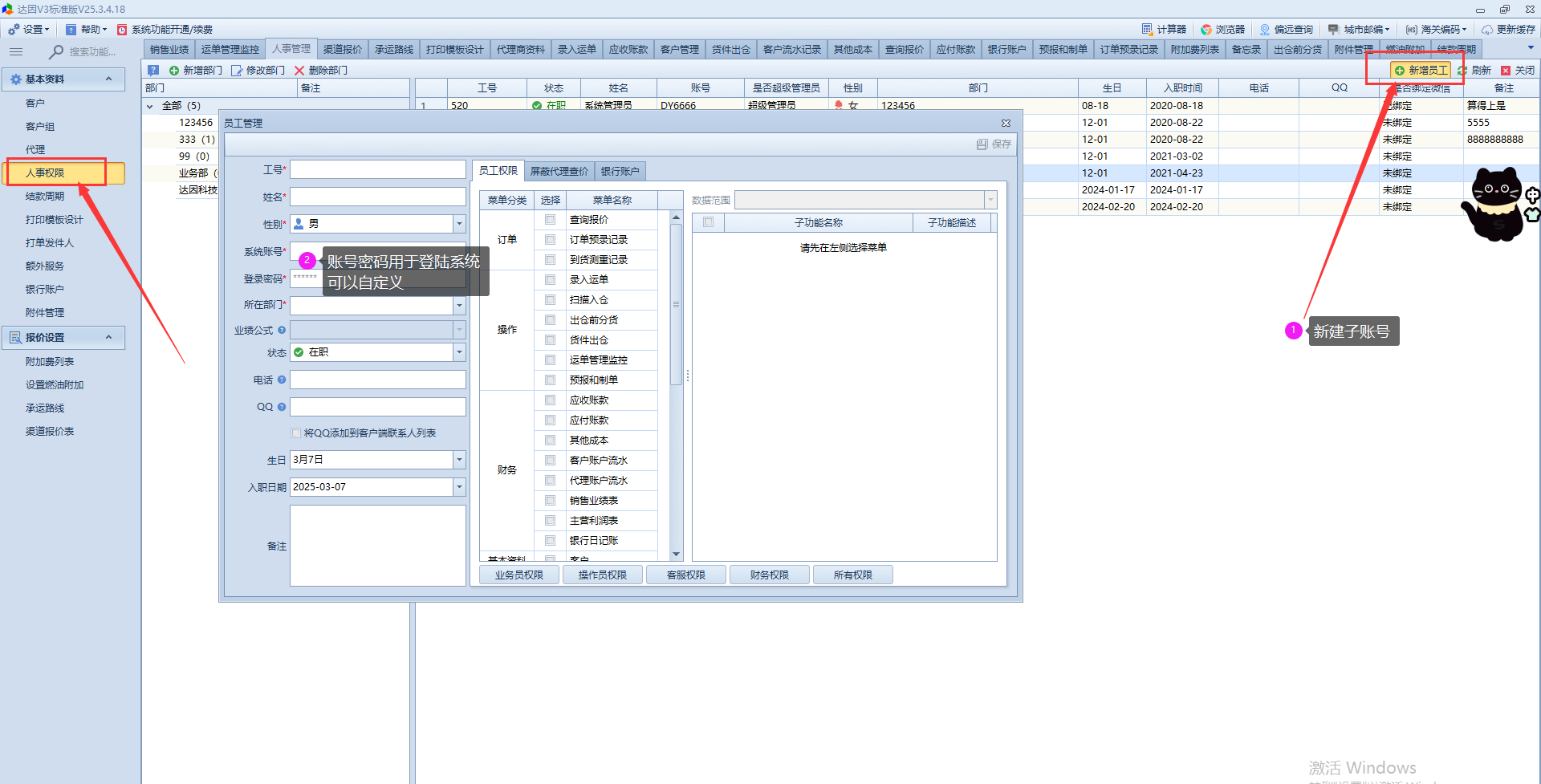 目录 搜索 系统简介功能列表查询报价订单预录记录到货测重记录录入运单扫描入仓出仓前分货货件出仓运单管理监控预报和制单财务应收账款应付账款其他成本客户账户流水代理账户流水销售业绩主营利润表银行日记账自定义账单模板基本资料-设置引用代理渠道加利润作为客户价代理对接客户资料人事权限打印模板设计打单发件人额外服务银行账户附加费列表设置燃油附加承运路线渠道报价渠道附加费及条件设置浏览器常用问题刚开通如何配置基础数据怎么对接代理打单如何删除对接的代理Fedex(新版RESTful接口)授权流程DHL Parcel DE 授权流程(v2版本)敦煌对接EMS对接UPS(新版RESTful接口)操作流程账单模板原始文件系统对外接口api微信公众号怎么绑定系统达因移动OA查价空白的解决方法公众号链接后缀客户端对接到微信公众号系统常见问题和快捷方式运单管理监控自定义教程速递管家获取API参数教程哲盟获取API参数教程如何在客户端下单视频教程 暂无相关搜索结果! 本文档使用 MinDoc 发布 人事权限 人事权限 视频演示人事权限;点开后右上角新增员工子账户,账号密码名称都可以自定义,新增好安装系统登陆即可。 权限设置;可以自定义勾选,勾选权限时需注意(隐私设置及红色字体的权限)每个功能板块都可以自定义数据范围,可以自定义勾选每个功能的修改和删除功能 注;隐私权限 红色字体权限需注意勾选文档更新时间: 2025-10-17 13:55 作者:dy13750292337