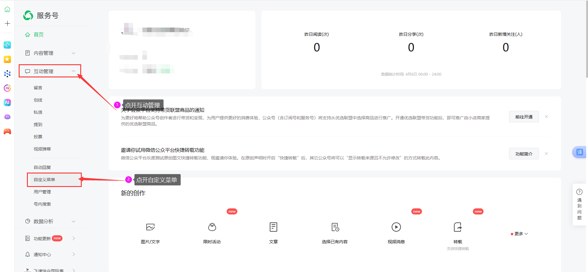 首先等于微信公众号后台,点开“互动管理”,“自定义菜单”。