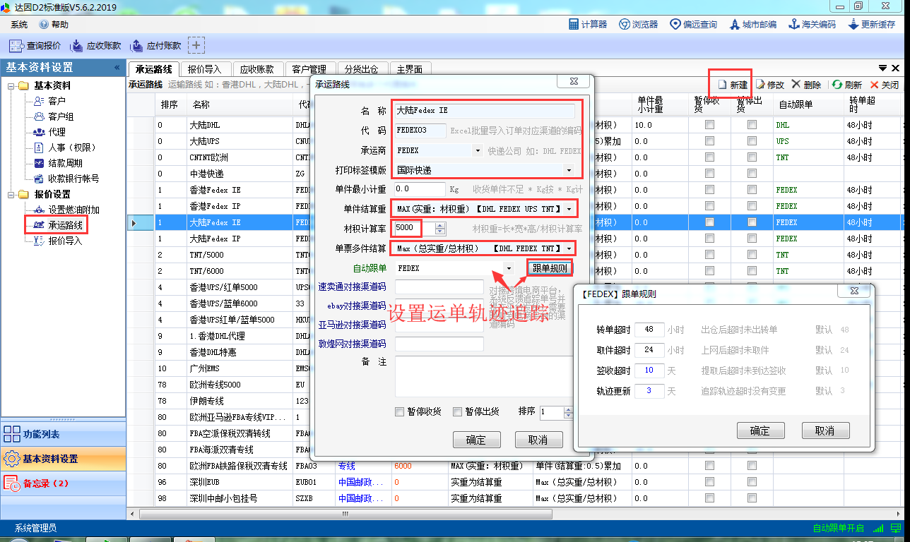 以下为承运路线的设置(淡蓝色背景输入框为必填项