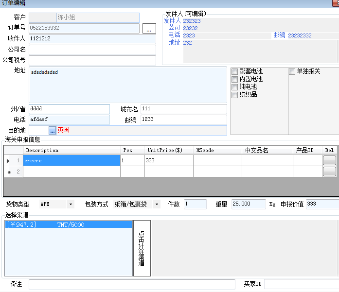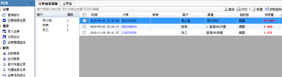 目录 搜索 新用户下载安装教程达因D2简介达因D2标准版基础概念说明刚开通怎么使用客户端对接微信公众号功能列表查询报价订单预录记录录入运单分货出仓运单管理监控应收账款应付账款运单毛利统计基本资料设置客户代理人事(权限)设置燃油附加承运路线报价导入如何建立营销公布价如何设置收货条件和附加费常用功能一键获取追踪单号如何接入代理报价自定义导出账单模版常见问题(点击左侧展开)弹出异常 CLR error:80004005系统更新异常(WIN10)WIN10安装提示无法安装.NET未能加载文件或程序集更新文件加载异常客户端查价显示不了价格排查WIN7系统安装系统常见问题框选粘贴EXCEL表格变乱如何获取DHL追踪秘钥代理系统对接说明FEDEX打单对接哲盟系统对接API方法系统升级说明2021-06-21新增功能详细介绍20210621升级存在的查价问题及解决方案2021-12-15新增功能详细介绍2024新版部分功能简介 暂无相关搜索结果! 本文档使用 MinDoc 发布 订单预录记录 显示客户所有预录订单详细信息(客户通过网页客户端预录单) 双击订单行可以查看对应订单的详细信息,如下图 文档更新时间: 2019-05-22 15:44 作者:admin