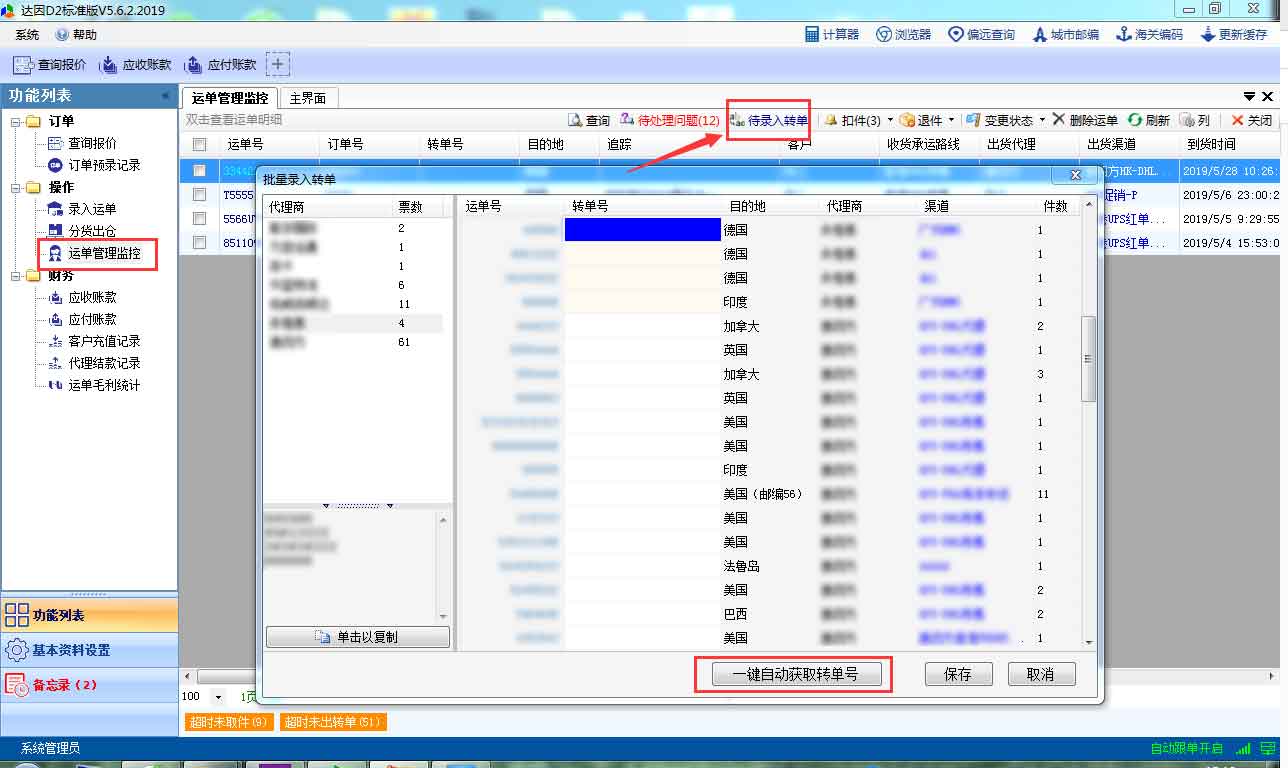 2.单击一键自动获取转单号 系统自动从所有已接入代理获取转单号并自动匹配输入,然后单击保存